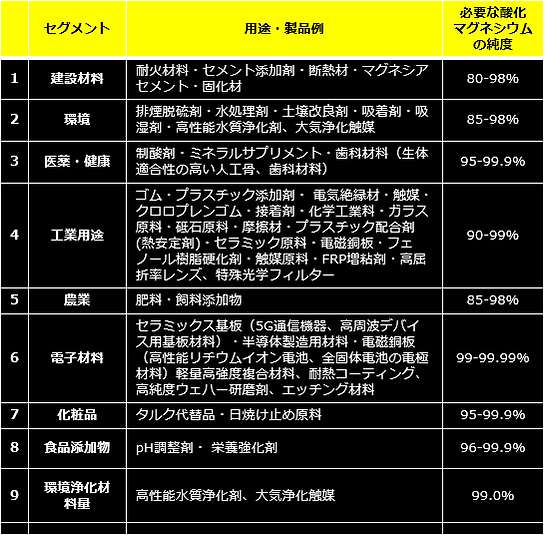 養殖では、水質調整剤として活躍し、魚類や貝類の成長を促進します。さらに、肥料や飼料としての用途を広げることで、持続可能な農業と漁業の実現を目指しています。酸化マグネシウムは、多角的な活用を通じて、食料供給の安定と地域経済の活性化に寄与する素材として注目されています。